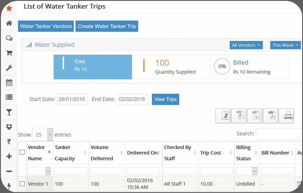 - View Billed/unbilled trips of any water tanker suppliers for a duration