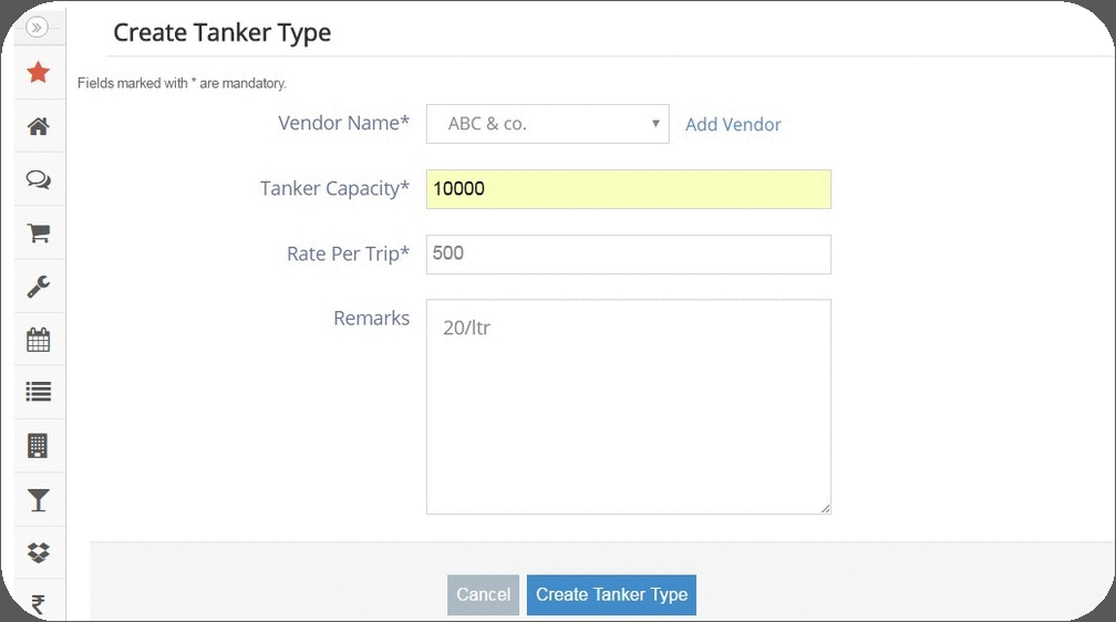 - Configure the tanker types (such as 5000 Liter Tanker, 7000 Liter Tanker etc..) for each supplier